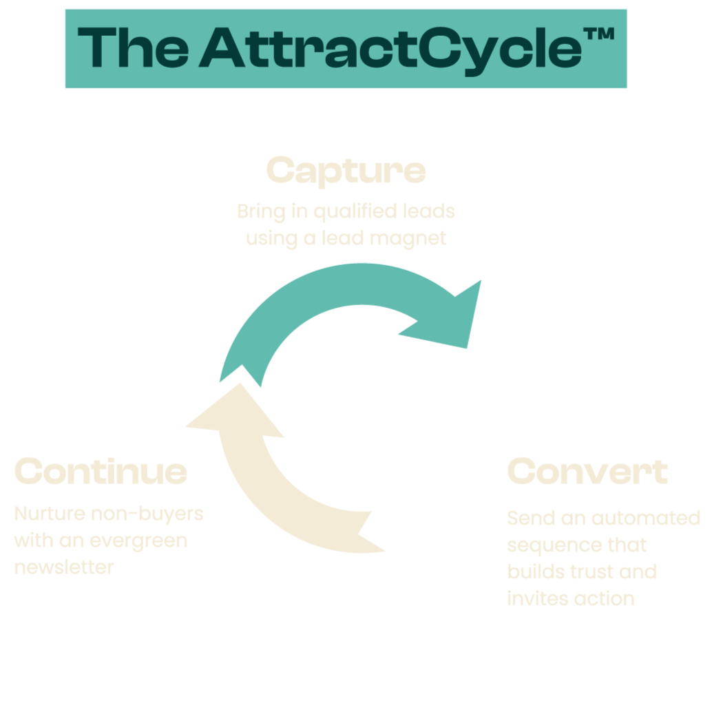 The foundation is Sebastian’s signature AttractCycle™ framework. It shows exactly how attention becomes subscribers, subscribers become customers, and customers become repeat business.
